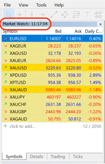Puedes consultar en todo momento la Hora actual del Servidor del Bróker directamente en MetaTrader.